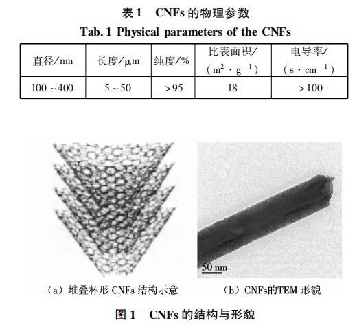 納米碳纖維(carbon nanofibers,CNFs)是近十年興起的一種新型亞微米增強(qiáng)纖維材料,它是化學(xué)氣相生長碳纖維的一種形式,一般通過裂解氣相碳?xì)浠衔镏苽洌菢?gòu)成以碳黑、富勒烯、單壁和多壁碳納米管為一端,以連續(xù)碳纖維為另一端鏈節(jié)中的一環(huán).CNFs的直徑一般在150~400nm之間,與碳納米管(CNTs)相比,CNFs的制備更易于實(shí)現(xiàn)工業(yè)化生產(chǎn).CNFs有著優(yōu)異的物理性能、力學(xué)性能和化學(xué)性能.研究表明,CNFs的抗拉強(qiáng)度可以達(dá)到2~5 GPa,平均彈性模量為300 GPa.除具有普通氣相生長碳纖維的特性,如低密度、高比模量、高比強(qiáng)度、高導(dǎo)電性等性能外,CNFs還具有缺陷數(shù)量少、比表面積大、結(jié)構(gòu)致密等優(yōu)點(diǎn),這使得CNFs在納米復(fù)合材料領(lǐng)域得到了廣泛的應(yīng)用.然而,納米復(fù)合材料的性能往往會受到兩個主要因素的影響,一個是納米材料在基體材料中的分散程度,另一個是納米材料表面與基體材料之間的黏結(jié)強(qiáng)度和能量.由于受到范德華力的的影響,CNFs彼此吸引并相互纏結(jié)在一起,懸浮于水的表面,幾乎無法均勻溶解,這大大制約了CNFs在復(fù)合材料中的應(yīng)用.如何解決CNFs在水性體系中的分散已成為研究者廣泛關(guān)注的熱點(diǎn).
