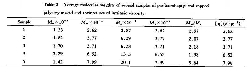 全氟庚雙酰過氧化物的熱分解屬于一級動力學(xué)反應(yīng),熱分解生成的全氟庚烷基自由基是一個非常活潑的自由基,可引發(fā)丙烯酸(AA)在較低溫度下聚合,但產(chǎn)率較低,如表1所示。GPC分子量測定結(jié)果(表2)表明,隨丙烯酸與全氟庚基摩爾比增加,產(chǎn)物分子量相應(yīng)增加,在低摩爾比情況下,多分散指數(shù)約在2左右,而高摩爾比時,分子量分布更寬,其多分散指數(shù)高達(dá)5以上。
