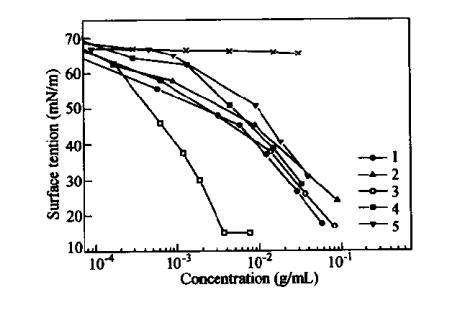 式中R是氣體常數(shù),T是絕對溫度,采用溶液表面張力對其對數(shù)濃度作圖可得出Gamma值,再由公式delta=1/left(N_0Gammaright)可以計算出cmc時每個分子在表面上所占據(jù)的平均面積delta(nm),其中N_0是阿弗加德羅常數(shù),結(jié)果列于表3。