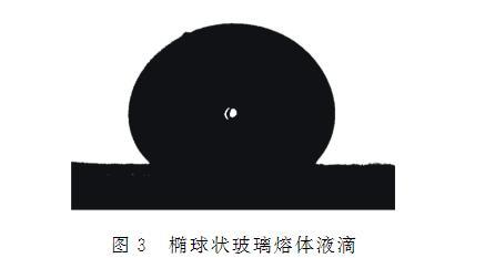 將制備的玻璃樣塊用錫紙包裹,用鐵錘捶碎后用鉗子修整成較方正的顆粒,選取內部無氣泡結石且質量為0.15~0.30g的碎塊用于測試。測試前選用T4溫度表面張力為334 mN/m的標準鈉鈣玻璃校準表面張力測量儀。測試的具體操作步驟如下:將表面張力測量儀加熱爐升溫至測量溫度,通入高純氮氣作為保護氣體,然后將制備好的玻璃樣品置于石墨片上,送入加熱爐中的樣品臺上進行保溫,試樣在表面張力作用下收縮成橢球狀液滴,如圖3所示,將液滴置于拍攝裝置視野中心,保溫30 min至熔體穩定。隨后,用圖像采集裝置獲取橢球熔體的外輪廓線,通過軟件數值分析得到輪廓參數,利用Young-Laplace方程進行解析,計算出樣品的表面張力(σ),反復測試若干次后取σ的平均值為樣品在該測試條件下的表面張力值。
