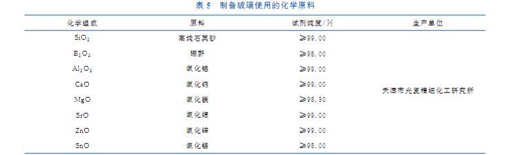 實驗所用的玻璃原料包括石英砂、氧化鋁、硼酐(氧化硼)、氧化鈣、氧化鎂、氧化鍶、氧化鋅,化學澄清劑所用原料為氧化亞錫,試劑純度等級均為分析純(AR),實驗設計引入成分及使用的原料種類、具體純度如表5所示,所有化學成分均以氧化物原料的形式引入,玻璃成分中除原料可能含有的部分雜質以外,均不含任何人為引入的其他成分。
