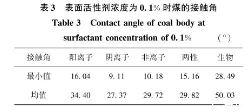 以接觸角作為判斷潤(rùn)濕的標(biāo)準(zhǔn),接觸角越小則潤(rùn)濕性能越好。表面活性劑濃度為0.1%時(shí),煤巖接觸角統(tǒng)計(jì)結(jié)果見(jiàn)表3。當(dāng)活性劑水溶液濃度為0.1%時(shí),陰離子表面活性劑AES水溶液與煤的接觸角最小為9.11°。進(jìn)一步將不同類(lèi)型表面活性劑水溶液在濃度為0.1%時(shí)與煤的接觸角進(jìn)行均值化處理可發(fā)現(xiàn),陽(yáng)離子、陰離子、非離子、兩性及生物表面活性劑水溶液與煤的接觸角平均值分別為34.4°、27.37°、29.72°、29.82°和50.03°。因此,表面活性劑潤(rùn)濕性效果排序?yàn)椋宏庪x子表面活性劑>非離子表面活性劑>兩性表面活性劑>陽(yáng)離子表面活性劑>生物表面活性劑。