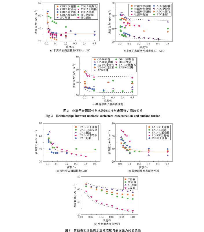 采用文獻(xiàn)調(diào)查法,匯總分析了82組不同類(lèi)型表面活性劑水溶液濃度與表面張力的對(duì)應(yīng)關(guān)系[19-34],如圖1~圖4所示。