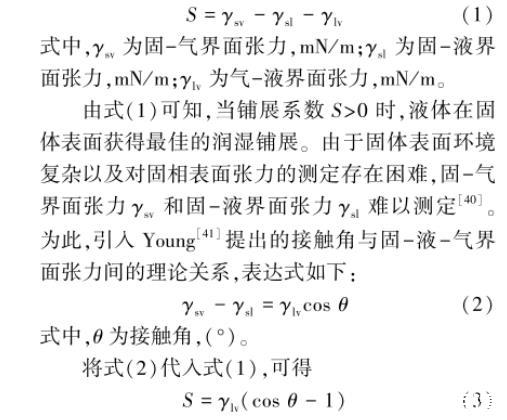 式中,γsv為固-氣界面張力,mN/m;γsl為固-液界面張力,mN/m;γlv為氣-液界面張力,mN/m。