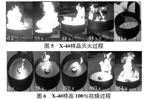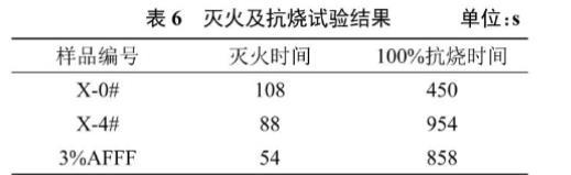 X-4#樣品泡沫具有高泡沫穩(wěn)定性,在以下研究中,著重研究X-4#與X-0#、3%AFFF相比的滅火及抗燒性能,測得的滅火時間及100%抗燒時間見表6。根據(jù)GB 15308—2006規(guī)定,滅火時間小于180 s,抗燒時間高于600s的泡沫被認(rèn)為具有成為消防泡沫滅火劑的潛力,X-4#樣品滅火時間88s、抗燒時間954 s,抗燒時間優(yōu)于3%AFFF,滅火時間比3%AFFF略高,但滿足消防用泡沫滅火劑性能要求,具有良好的消防滅火應(yīng)用潛力。