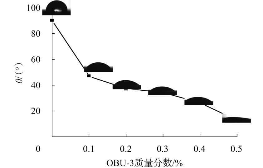 圖5 OBU-3質(zhì)量分?jǐn)?shù)對(duì)原油處理巖石薄片后接觸角的影響