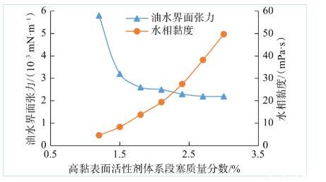 圖1 OBU-3低黏表面活性劑體系含量對(duì)界面張力和水相黏度的影響