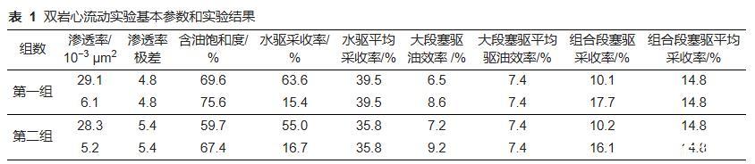 從表1可知,通過并聯天然巖心表面活性劑驅油實驗發現,只用大段塞驅平均提高采收率7.4個百分點,非常低。而采用組合段塞進行調和驅,第一組組合段塞驅在高低滲層分別提高驅油效率10.1個百分點和17.7個百分點。第二組組合段塞驅在高低滲層分別提高原油采收率10.2個百分點和16.1個百分點,兩組組合段塞驅平均提高采收率為14.8個百分點,比只用大段塞驅平均采收率提高了1倍,達到了聚/表二驅的驅油效果。