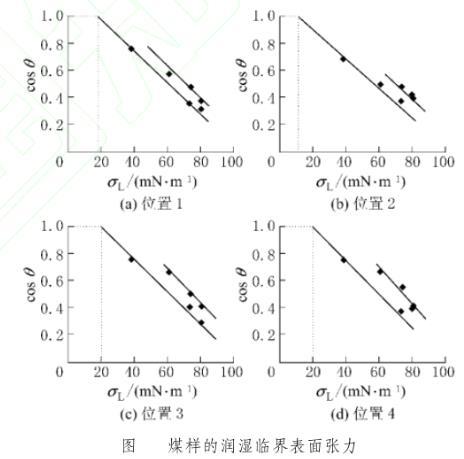 由圖2可知,煤樣不同位置處的臨界表面張力不同,按照式(3)計算得到位置1—4的臨界表面張力依次為:17.1、10.5、19.9、21.1 mN/m,分析其原因主要有2點:一是系統(tǒng)本身所具有的人為誤差的可能;二是測點位置煤樣表面粗糙度不同。因此,成莊礦煤樣的總體臨界表面張力取4個不同位置臨界表面張力值的算術平均值為17.15mN/m。因此,凡是表面張力低于17.15 mN/m的水都能以零度接觸角潤濕在成莊礦煤體表面上;表面張力大于17.15 mN/m的不同種類水,表面張力越逼近該值的,其對該煤樣的潤濕效果越好,越有利于煤層注水。