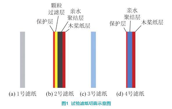 濾紙的切面結構如圖1所示。1號濾紙為單層親水材料。2號濾紙由保護層a、顆粒過濾層b、親水聚結層c和木漿紙層d組成,木漿紙作為基層材料,c和d層、b與c層均由樹脂粘結,a與b層通過超聲波焊接在一起。3號濾紙為聚四氟乙烯編織而成的單層網狀濾紙。4號濾紙由保護層a、疏水過濾層b和基層c組成,4號濾紙的粘結工藝與2號濾紙相同,保護層和疏水層由超聲波焊接在一起,基層和疏水層使用樹脂進行粘結。