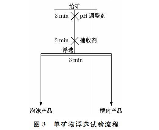 采用一次粗選的試驗流程,探究十二胺(DDA)和YTDB在不同礦漿pH、不同捕收劑用量下,對石英以及赤鐵礦回收率的影響。單礦物浮選試驗在XFD-Ⅲ浮選機進行,在室溫條件下配制礦漿,稱取2.00 g的單礦物放入浮選槽中,再加入20 g去離子水,控制浮選機的攪拌速度為1900 r/min,攪拌2 min以充分攪勻礦漿。加入事先準備好的pH調整劑調漿3 min,再加入捕收劑調漿3 min后,開始刮泡,控制刮泡時間為3 min.浮選結束后,將精礦進行過濾、烘干、稱重,隨后計算其回收率。單礦物浮選試驗流程如圖3所示。