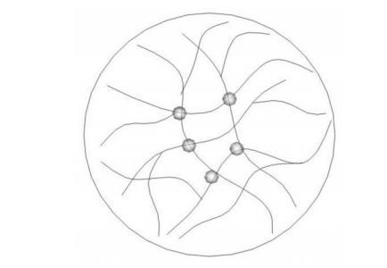聚合物驅(qū)是油田開發(fā)穩(wěn)產(chǎn)增產(chǎn)最重要的技術(shù)手段之一,在國內(nèi)外油田得到了廣泛的應(yīng)用。但聚驅(qū)后油藏儲(chǔ)層非均質(zhì)性加劇,剩余油分布更加分散,常規(guī)方法已經(jīng)無法滿足生產(chǎn)實(shí)踐的需要。近年來,改性聚丙烯酰胺已成為研究熱點(diǎn),其中黏彈性顆粒驅(qū)油劑(B-PPG)由于其獨(dú)特的性能更是得以快速發(fā)展。B-PPG是通過多官能團(tuán)引發(fā)合成的高分子支化鏈與三維交聯(lián)網(wǎng)絡(luò)結(jié)構(gòu)共存的聚丙烯酰胺,其分子結(jié)構(gòu)示意圖如Fig.1所示。這種“軟固體”凝膠顆粒以固體顆粒的形式懸浮于溶液中,具有較好的變形能力,運(yùn)移過程中時(shí)堵時(shí)驅(qū),可以有效調(diào)節(jié)地層的非均質(zhì)性。同時(shí),其又具有較好的耐溫抗鹽、耐老化能力。目前,B-PPG驅(qū)油劑已經(jīng)在勝利油田、河南油田推廣應(yīng)用,增油降水效果明顯。
