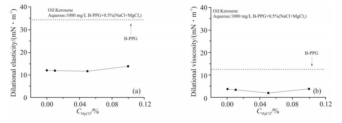 Ca2+濃度對1000mg/LB-PPG溶液界面擴張參數的影響見Fig.7。從圖中可以看出,電解質中Ca2+含量增大對界面擴張黏性的影響較小;而擴張彈性則在低Ca2+濃度條件下略有變化,從12mN/m增大到17mN/m。二價陽離子能夠與2個負電荷發生靜電吸引作用,因此,可作為“橋梁”,與不同B-PPG分子中的負電荷發生作用,增加聚集體結構的強度。Ca2+比Mg2+半徑大,與不同B-PPG分子發生作用的幾率也大,增大擴張彈性的幅度較大。