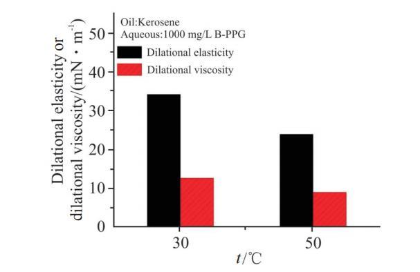 溫度對1000 mg/L B-PPG溶液界面擴張彈性和黏性的影響見Fig.9。實驗結果表明,當溫度從30℃升高到50℃時,界面擴張彈性和黏性均明顯降低。隨著溫度升高,界面膜變得疏松,同時,B-PPG分子的熱運動加劇,擴散交換過程變快,上述變化均會造成界面膜強度的降低,50℃時B-PPG界面膜的彈性和黏性不到30℃的1/2。