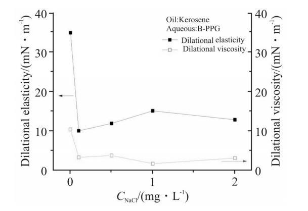 Fig.4為NaCl濃度對1000mg/L的B-PPG溶液界面擴張參數的影響。由圖可知,加入NaCl后,體系的界面擴張彈性和擴張黏性都明顯下降,擴張彈性降低超過了20mN/m,擴張黏性也由10mN/m左右下降到了5mN/m左右。