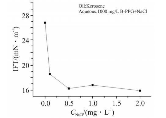 在油田開采過程中,油藏溫度是必須考慮的要素之一。對于分子結構中含聚氧乙烯基團(EO)的表面活性劑,溫度升高會破壞EO與水分子形成的氫鍵,增大表面活性劑的油溶性,對界面張力的影響較大。而對于離子型表面活性劑,溫度對界面張力的影響較小。Fig.8示出了1000mg/L B-PPG溶液在30℃和50℃時的動態界面張力。由圖可見,在50℃時,體系的界面張力比30℃時降低了5mN/m左右。B-PPG的水溶性很大程度來源于酰胺基團與水分子形成的氫鍵,因此,溫度升高,B-PPG的油溶性增大,界面吸附量有所增加,界面張力明顯降低。