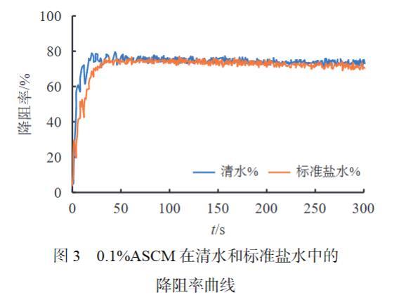 使用CDMZ-IV型管路摩阻儀模擬14 m3/min的施工排量分別測試0.1%ASCM在清水、標準鹽水中的降阻性能,。