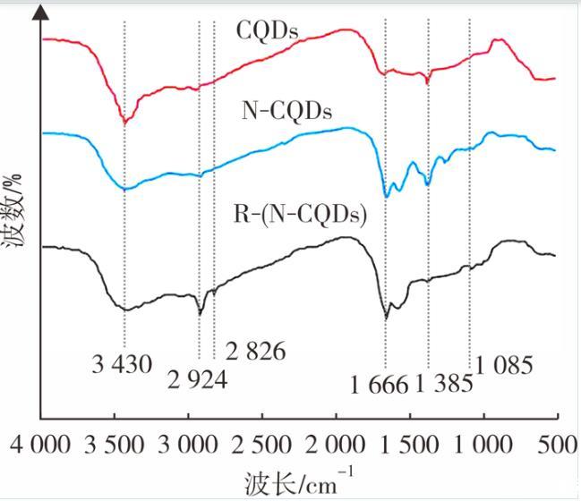圖2是CQDs、N-CQDs與R-(N-CQDs)的紅外吸收光譜,在3 430 cm-1處的吸收峰是O-H和N-H伸縮振動,相比于N-CQDs,R-(N-CQDs)在此處的吸收峰較弱,說明在N-CQDs基礎上發(fā)生了一定程度的烷基化反應,而CQDs在此處的峰比N-CQDs與R-(N-CQDs)的峰要窄,因為CQDs上只存在O-H的伸縮振動,在2 924 cm-1和2 824 cm-1處的吸收峰是C-H的伸縮振動,R-(N-CQDs)在此處的吸收峰比N-CQDs的要強。1 660 cm-1處的吸收峰對應于酰胺基團C=O鍵的拉伸振動,1 385 cm-1處的峰為C-O伸縮振動,1 085 cm-1處的峰為胺類烷基的C-N振動,R-(N-CQDs)在此處的峰較N-CQDs更為明顯,而CQDs在此處看不到任何吸收峰,進一步說明在R-(N-CQDs)在N-CQDs的基礎上完成烷基化改性成功引入碳長鏈。圖2表明實現(xiàn)了將氮原子摻雜到碳量子點中的目標,并且在此基礎上引入了碳長鏈對其進行表面修飾。