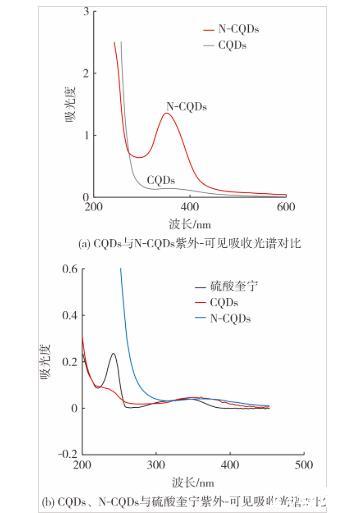 圖4(a)是CQDs與N-CQDs的紫外-可見吸收光譜。與CQDs的吸收光譜相比,N-CQDs在波長為350 nm處有一個明顯的吸收峰,這是酰胺基團中的C=O的n→π躍遷所致,在長波段方向出現(xiàn)吸收帶。這也表明氮原子已被成功引入碳量子點中。圖4(b)是以參比法計算熒光量子產(chǎn)率CQDs和N-CQDs以及硫酸奎寧的紫外吸收光譜對比,從圖4(b)可以看出,三者吸光度在波長為300~400 nm區(qū)間內(nèi)基本接近,且數(shù)值上沒有超過0.05,滿足量子產(chǎn)率計算條件要求,可以此濃度為基礎計算熒光量子產(chǎn)率。