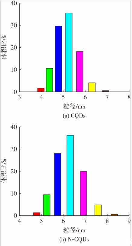 圖3是CQDs和N-CQDs的粒徑分布直方圖。由圖3可知,兩種碳量子點的粒徑分布都比較均勻,CQDs粒徑集中分布在(5.25±0.5)nm,N-CQDs粒徑集中分布在(6.31±0.5)nm,且都在10 nm以下,符合碳量子點的粒徑特征。此外,N-CQDs的粒徑整體略大于CQDs,可能是由于氮原子的摻雜打破了碳量子點的完整晶格結(jié)構(gòu),導致碳量子點發(fā)生晶格畸變和扭曲,進而影響形成的碳量子點的粒徑。