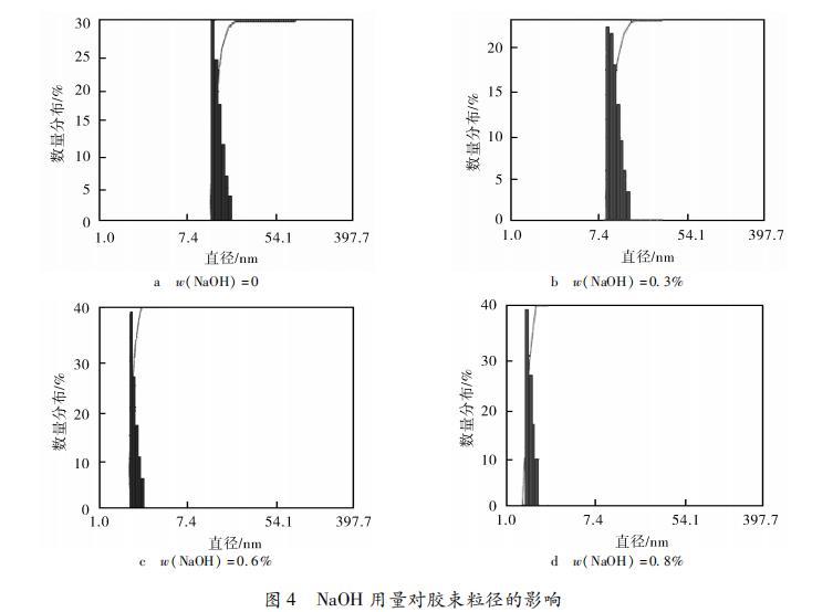 以去離子水配制不同NaOH含量的質量分數為0.3%的HABS溶液,利用動態光散射技術考察NaOH對HABS溶液膠束大小的影響,結果如圖4所示。