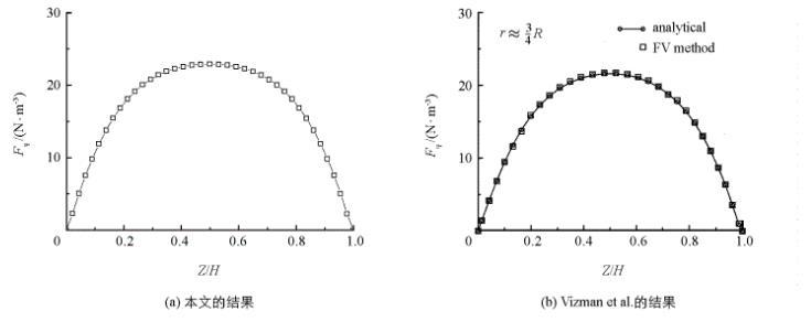 本文對液橋的三維網(wǎng)格進(jìn)行了有效性驗(yàn)證,最終采用60×68×60的非均勻計(jì)算網(wǎng)格。為了驗(yàn)證計(jì)算程序的可靠性,本文對Vizman et al。文中的Rayleigh-Bénard結(jié)構(gòu)的算例進(jìn)行了重復(fù)。(采用導(dǎo)電的鎵熔體材料的相關(guān)參數(shù)為:密度ρ=6。1×10^3 kg/m^3,熱膨脹系數(shù)β=1。26×10^-4 /K,動力學(xué)粘度ν=1。907×10^-7 kg/ms,擴(kuò)散系數(shù)κ_T=9。22×10^-6 kg/ms,電導(dǎo)率σ=3。87×10^6 A/Vm)。圖2為二極對非均勻旋轉(zhuǎn)磁場下,本文計(jì)算得到的熔體在r=3R/4處周向方向的洛倫茲力的分布曲線(a)和文獻(xiàn)結(jié)果(b)。由圖可知,熔體在r=3R/4處熔體周向的洛倫茲力呈拋物線型分布,并在z=0。5H處達(dá)到最大值。本文的計(jì)算結(jié)果與Vizman et al。的結(jié)果較好地吻合,且計(jì)算所得的周向洛倫茲力的最大值與Vizman et al。通過數(shù)值計(jì)算和實(shí)驗(yàn)得到的最大值的相對誤差為1。8%。該結(jié)果驗(yàn)證了本文計(jì)算程序的可靠性。