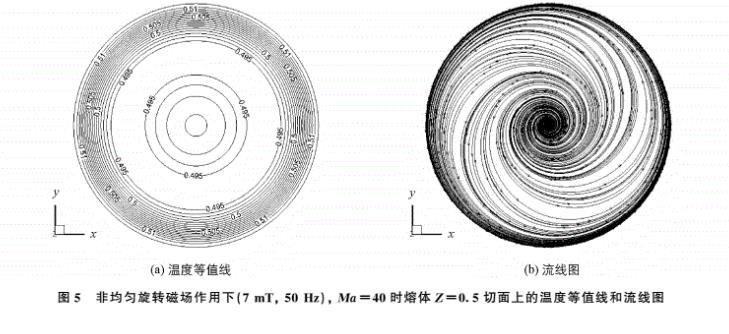 在外加二極對非均勻旋轉(zhuǎn)磁場(7 mT、50 Hz)作用下,浮區(qū)液橋失穩(wěn)后的三維非軸對稱的對流特性得到有效地改善。圖5為二極對非均勻旋轉(zhuǎn)磁場作用下,Ma=40時的半浮區(qū)液橋在Z=0。5H切面上的溫度等值線和流線圖。從5(a)中可以看出,二極對非均勻旋轉(zhuǎn)磁場的周向攪拌作用下,熔體Z=0。5H切面上的溫度以中心軸為中心呈現(xiàn)出明顯的軸對稱分布特性;熔體在Z=0。5H切面上由液橋中心向自由表面流動,形成周向渦流結(jié)構(gòu),如圖5(b)所示。研究結(jié)果表明,二極對非均勻旋轉(zhuǎn)磁場的周向攪拌作用下,Ma=40時熔體的三維非軸對稱表面張力對流得到有效地控制,此時二維軸對稱流動特性明顯。