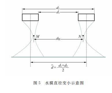 圖5給出了水膜直徑變小示意圖。吊環(huán)拉出的水膜,其內(nèi)表面、外表面都是雙曲面,但不對(duì)稱(chēng)。一般而言,外表面的曲率半徑較小,而內(nèi)表面的曲率半徑較大,2個(gè)曲面頂點(diǎn)處的位置(圖5中M和N所示)將偏離吊環(huán)內(nèi)、外徑的平均值d?=(d1+d2)/2,如圖5中的豎直虛線(xiàn)所示。所以水膜斷裂處的直徑d斷,將小于吊環(huán)的d?,即d斷 < d?。由表2數(shù)據(jù)可以看出,隨著吊環(huán)直徑的減小,對(duì)應(yīng)水膜的內(nèi)、外曲面的不對(duì)稱(chēng)程度增加,斷裂處水膜直徑的收縮程度("頸縮")增大,所以2個(gè)直徑的比值d斷/d?變小。