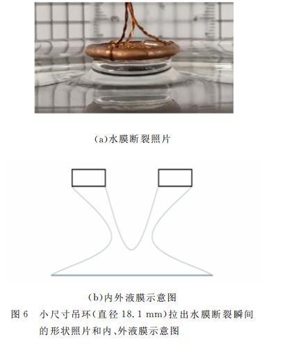 另一方面,對(duì)于尺寸較小的吊環(huán),如圖6所示,水膜的內(nèi)表面將連接在一起,只有外表面的表面張力起作用,但在計(jì)算公式中,仍以2πd?代入式(5)中,所以表面張力系數(shù)的計(jì)算值偏小。標(biāo)準(zhǔn)環(huán)的尺寸適中,環(huán)壁很薄,所以圖1(c)與圖1(d)水膜形狀近似相同,實(shí)際測(cè)量的F等于U斷前,因此計(jì)算得到的α2誤差很小。可見(jiàn),選用水膜斷裂點(diǎn)計(jì)算的表面張力系數(shù)的影響因素很多,實(shí)際斷裂點(diǎn)的瞬間位置、吊環(huán)尺寸、吊環(huán)厚薄等都是需要考慮的因素。