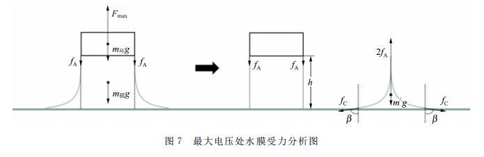 采用隔離法,對(duì)電壓最大值處的水膜進(jìn)行受力分析。圖7中虛線(xiàn)將水膜分成2部分,吊環(huán)正下方的水膜由于水分子相互吸引力附加在拉力Fmax中,而另一部分水膜的重力m′g,與2fA以及水膜與液面處的表面張力2fCcosβ,三者形成平衡狀態(tài),即受力分析與水膜斷裂時(shí)[圖1(d)]m2的受力相似。所以計(jì)算水膜的重力僅僅需要考慮吊環(huán)正下方的重力即可。另外,電壓最大值處的水膜穩(wěn)定性最好,拉升高度h容易測(cè)量。對(duì)于尺寸較小的吊環(huán)(πd?=78.2 mm),電壓最大值處,水膜的內(nèi)表面沒(méi)有連接在一起,仍然與液體表面接觸良好,所以測(cè)量的誤差也較小(Eα1=3.9%)。但是對(duì)于特別小的吊環(huán)(πd?=57.4 mm),水膜的內(nèi)表面連接在一起,其表面張力系數(shù)明顯偏小。