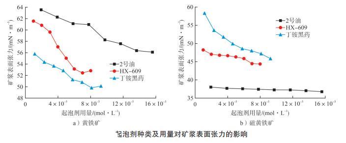 結(jié)果發(fā)現(xiàn):隨著起泡劑用量的增加,黃鐵礦與磁黃鐵礦的表面張力均整體呈下降趨勢(shì)。對(duì)于黃鐵礦礦漿表面張力的影響,2號(hào)油>HX-609>丁銨黑藥,HX-609的表面張力雖然不是最低,但 HX-609達(dá)到最低礦漿表面張力所用藥劑用量最少,可以明顯降低藥劑使用成本。對(duì)于磁黃鐵礦礦漿表面張力的影響,丁銨黑藥>HX-609>2號(hào)油,且三者差值較大,2號(hào)油用量為3×10?? mol/L時(shí)可顯著降低礦漿表面張力。