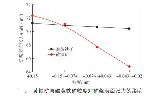結(jié)果發(fā)現(xiàn):粒度越細(xì),礦漿表面張力越小。隨著粒度從+0.15 mm降低至-0.043~+0.02 mm,黃鐵礦礦漿表面張力下降較為明顯,從 72.35 mN/m降低至 64.83 mN/m;磁黃鐵礦礦漿表面張力下降幅度較小,礦漿表面張力從71.24 mN/m降低至70.46 mN/m。