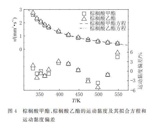 圖4 棕櫚酸甲酯、棕櫚酸乙酯的黏度及其與方程(6)計算值的偏差