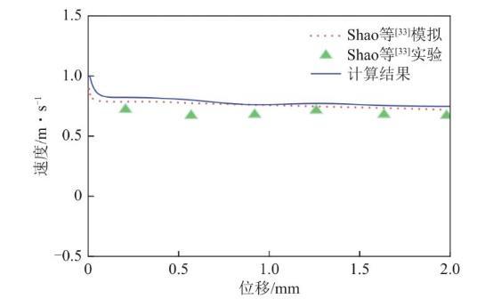圖4 顆粒速度-位移曲線的實驗與模擬結果