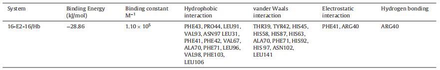 Hb 中的 α 和 β 鏈具有相似的結(jié)構(gòu)折疊, 由七個連續(xù)的α-螺旋和兩條鏈組成 包含由螺旋 4 和 5 包圍的間隙結(jié)合袋,而空腔的底部由 C 端部分形成 螺旋 6 和螺旋 7 的 N 端片段 [69]。 16-E2-16為主 Hb 與中央空腔、α1 和 β2 鏈結(jié)合(圖 6A)。 這 該結(jié)合位點上的氨基酸殘基包括 Thr39, α1 中的 Tyr42、Phe43、Pro44、His45、His58、His87、Leu91、Val93、Asn97 鏈和 Leu31、Arg40、Phe41、Phe42、His63、Val67、Ala70、Phe71、 His92, Leu96, His 97, Val98, Asn102, Phe103, Leu106, Leu141 in β2 鏈圖 6B。 有超過 20 個氨基酸殘基位于 16-E2-16 的站點,這意味著它們之間的強相互作用 16-E2-16 和 Hb [70]。 疏水性和靜電力作用 在 16-E2-16 與 Hb 的結(jié)合中起重要作用,這個結(jié)果是 與我們的實驗結(jié)果一致。 然而,范德瓦爾斯 力量不容忽視。 已觀察到一個氫鍵 在 16-E2-16/Hb 相互作用中的 16-E2-O 原子 具有 β2 鏈 ARG40 的 16 個分子(圖 6C)。 的形成 氫鍵穩(wěn)定 16-E2-16/Hb 復(fù)合物。 的類型 相互作用和參與相互作用的氨基酸殘基 以表格形式顯示(表 3)。