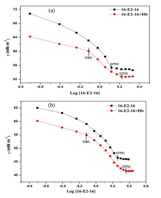 表面張力測量用于研究 關(guān)于 16-E2-16/Hb 相互作用的定性信息 空氣/水界面。 圖 1 顯示了 16-E2-16 分布的表面張力與對數(shù)濃度在不存在和 在不同溫度下存在 Hb (5 μM)。 斷點 表面張力與表面活性劑濃度對數(shù)的關(guān)系 不同溫度下純表面活性劑的文件對應(yīng) 到相應(yīng)溫度下表面活性劑的 cmc。 這 16-E2-16/Hb體系的表面張力曲線呈現(xiàn)兩個斷裂 點,第一個斷點對應(yīng)臨界聚合 濃度(cac)代表表面活性劑的開始 蛋白質(zhì)結(jié)合而作為第二個斷點對應(yīng)于 在 Hb 存在下 16-E2-16 的 cmc。 16-E2-16 的 cmc 在不同溫度下不存在和存在 Hb 的情況下 列在表 1 中。從這些值可以看出,16-E2-16 的 cmc 隨著 Hb 的存在和溫度升高而增加。 在 Hb 存在下 cmc 的增加證實了 16-E2-16/Hb 復(fù)合物的形成,在此期間一些單體 與 Hb 結(jié)合,因此無法形成膠束 進而導(dǎo)致膠束化延遲 [54]。 表1還 表明 cmc 值隨溫度升高而增加 這意味著疏水力的參與,它們是 溫度依賴,在 cmc 的蛋白質(zhì)表面活性劑相互作用中。 這可以歸因于 16-E2-的溶解度增加 16 單體隨溫度變化而抑制膠束化。 此外,較高的溫度有利于熱運動,這會導(dǎo)致 更多的分子與 Hb 結(jié)合。 但是,cac 保持不變 在所有溫度下。 因此,我們可以認為 16-E2-16 與 Hb 結(jié)合 通過 cac 附近的靜電相互作用,因為靜電 相互作用不受溫度影響。 此后,作為 表面活性劑濃度增加,蛋白質(zhì)通過疏水力與表面活性劑相互作用。 下表面張力值 Hb-16-E2-16系統(tǒng)比對應(yīng)的16-E2-16系統(tǒng)是 由于 Hb 的高表面活性。