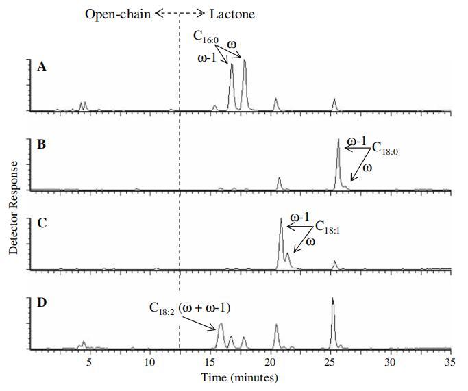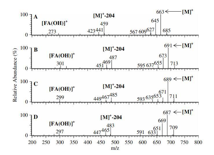 圖3正大氣壓化學電離(APCI)-來自圖2中每個TIC色譜圖基峰的質譜圖。 圖2的TIC中的C16:0二乙?;敝瑑弱ィ≧T=16.7分鐘)、圖2的TIC中的C18:0二乙?;敝瑑弱ィ≧T=25.2分鐘)、圖2c的TIC中的C18:1二乙?;敝瑑弱ィ≧T=20.7分鐘)和圖2d的TIC中的C18:2二乙酰化槐脂內酯(RT=15.8)。 ([M]+=質子化分子離子;[M]+-204=質子化分子離子-減去乙?;禾牵ㄙ|量204);[FA(OH)]+=質子化羥基脂肪酸)