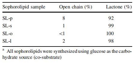 表1:通過LC/APCI MSa測定的由C.bombicola從棕櫚酸(SL-p)、硬脂酸(SL-s)、油酸(SL-o)、亞油酸(SL-l)酸生產的槐脂的結構含量(開鏈與內酯)