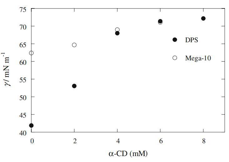 圖1恒定2 mM濃度下Mega-10和DPS的界面張力(γ)變化與α-CD濃度的關系圖