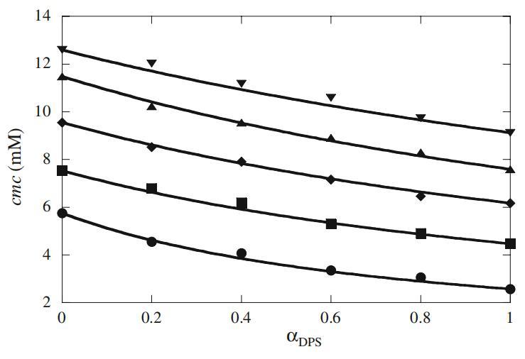 圖8 Mega-10+DPS混合系統的混合臨界膠束濃度(cmc)與αDPS的曲線圖。填充圓、正方形、菱形、三角形和反向三角形分別表示存在0(填充圓)、2(填充正方形)、4(填充菱形)、6(填充三角形)和8(填充反向三角形)mMα-CD時的實驗cmc。實線表示理想的cmc