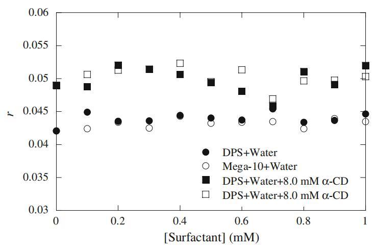 在這項工作中,我們研究了RB與表面活性劑-α-CD-水三元體系的詳細相互作用,以便系統地研究RB的極化行為。在進入膠束介質之前,我們排除了RB與水溶液和水溶液α-CD介質中前冰層表面活性劑濃度(1 mM)的結合行為。圖10顯示了在冰層前表面活性劑濃度下,Mega-10和DPS的RB各向異性行為。在水中和存在α-CD(8mm)的情況下,我們未觀察到表面活性劑RB的右旋值有任何顯著變化。從圖10獲得的結果意味著探針RB不與表面活性劑單體、環糊精和α-CD表面活性劑包合物結合。在這些初始測量之后,我們將我們的實驗方法擴展到膠束介質,以觀察RB的各向異性行為。圖11顯示了純表面活性劑以及Mega-10和DPS二元混合物(15mm)的α-CD(2-8mm)依賴性各向異性行為。從圖11可以得出一些有趣的結論。首先,圖11清楚地表明,在水介質中,純Mega-10的膠束比DPS的膠束具有更高的微粘度。這種行為可以用表面活性劑分子在膠束中的堆積排列來解釋,表明Mega-10膠束中的堆積比DPS膠束中的更緊密。對于二元混合物,r值隨著DPS(αDPS)摩爾分數的增加而減小,這表明DPS被誘導到混合膠束中產生的剛性結構較低(參見圖11中最左邊的圖例)。其次,在DPS的每摩爾分數下,r值隨α-CD濃度的增加而線性減小。盡管隨著α-CD濃度的增加,在αDPS=0.0時,r值的下降更為瞬時。我們注意到,r值的瞬時降低是由于膠束濃度的降低。為了證實這一結果,我們在20 mM濃度下對αDPS=0.0(即Mega-10)進行了各向異性測量,圖12中繪制了Mega-10的觀測r值,并與15 mM濃度下的αDPS=1.0(即DPS)進行了比較。正如我們所見,隨著α-CD濃度的增加,Mega-10(20 mM)的r值沒有瞬時下降,這表明圖11中r值的急劇下降是由于膠束濃度的降低。DelaCruz等人研究了RB衍生物與陰離子、陽離子和非離子表面活性劑的相互作用,并得出結論,RB衍生物的酯鏈的電荷和長度控制著與不同膠束系統的相互作用[35]。