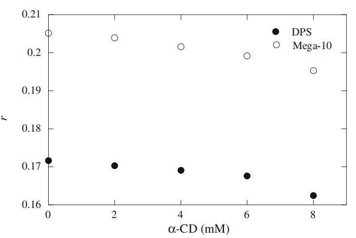 圖12恒定表面活性劑濃度(Mega-10,20 mM和DPS,15 mM)下熒光各向異性r與α-CD濃度的關系圖