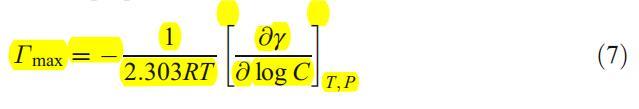 根據γ與log Cs/mol dm的曲線圖?3,我們評估了純表面活性劑和混合表面活性劑在空氣-水界面上的界面吸附參數,在沒有和存在不同的α-CD濃度的情況下。表面活性劑在cmc下的表面過量值Γmax表示表面活性劑在空氣-水界面上的吸附量。稀溶液的表面過剩值可根據吉布斯方程確定,如下[27]: