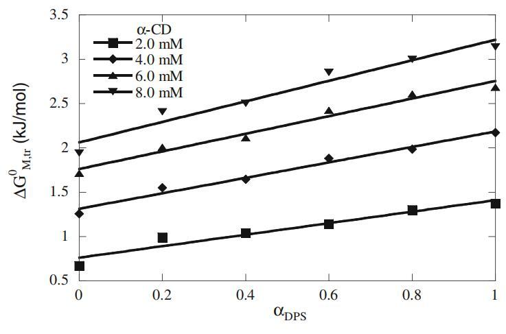 根據cmc值,我們評估了純表面活性劑系統和混合表面活性劑系統在不存在和存在α-CD的情況下的膠束化標準自由能(數據未顯示)[27],隨后,通過膠束轉移標準自由能評估添加劑對膠束化的影響(?GM,tr 0),從水相到含有α-CD的水相[19]。這些值如圖5所示,在不同α-CD濃度下,在整個DPS摩爾分數范圍內為正值,表明α-CD的存在使膠束形成不利。此外,這些值隨著α-CD濃度的增加而線性增加,在高α-CD濃度下斜率更高,表明混合膠束的形成延遲。