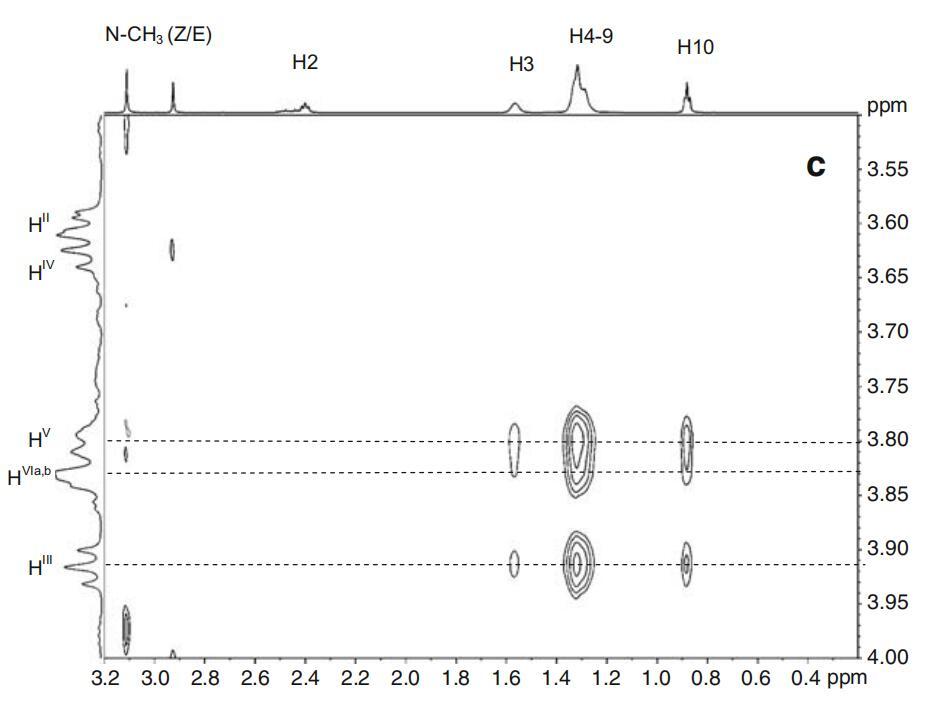 圖7α-CD(所示為一個吡喃葡萄糖苷單元)、DPS和Mega-10的示意圖。表面活性劑和α-CD的2D-ROESY光譜的關注區域。阿拉伯數字表示表面活性劑原子,而羅馬數字表示CD原子。b為DPS-α-CD系統。Mega-10-α-CD系統的c