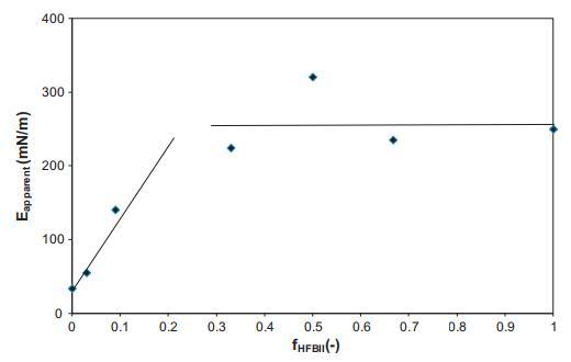 為了便于比較,從圖1的數據中,使用表面壓力第一次上升的斜率(由第一次壓縮產生)和公式E=(?2)提取了表觀膨脹模量(E)??1)/ln(A1/A2)。曲線的斜率總是在表面壓力在15到25 mN/m之間波動的表面積范圍內確定的。圖2顯示了表觀模量作為混合比的函數,表示為HFBII分數fHFBII=cHFBII/(cHFBII+cWPI)。