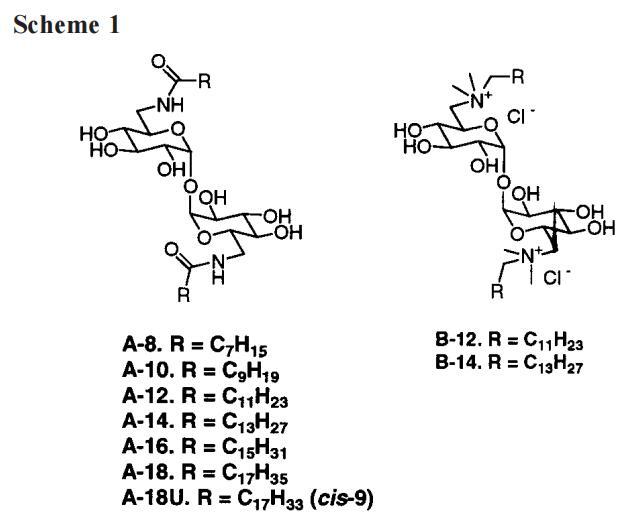 本文研究以海藻糖為間隔基的雙子座(方案1)。A系列由海藻糖組成,其6-和6′-羥基被長鏈酰胺取代。B系列在6-和6′位置有長鏈季銨鹽基團。我們選擇海藻糖作為糖間隔物并不是隨意的。首先,海藻糖是一種雙糖,允許兩條烴鏈相隔相當長的距離。雙子座中受限的分子內鏈/鏈相互作用是一種結構特征,過去僅對其進行了簡要研究。15秒后,海藻糖(一種從細菌、藻類、昆蟲和植物等多種自然來源中分離出來的糖)可以保護生物膜免受脫水的壓力。16因此,在生物膜的“細胞模擬”建模方面,我們對海藻糖雙子感興趣。17第三,從實用的角度來看,海藻糖很有吸引力,因為它包含兩個完全相同的D-葡聚糖單元。這簡化了化合物的合成和分析,與大多數其他雙糖相比,化學性質不同的羥基數量減少了一半。但盡管對稱,合成純海藻糖雙子座的途徑(方案2和方案3)無疑是隨后物理化學的一個乏味的序言。