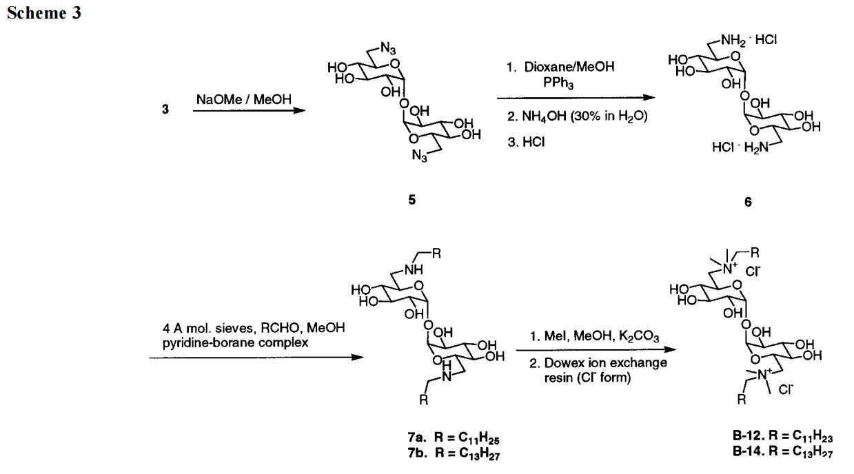 方案2和方案3以及實驗部分詳述了我們獲得A系列和B系列海藻糖雙子的方法。另外幾條評論有助于美化這一信息。B型海藻糖雙子最明顯的先驗途徑是用長鏈?zhǔn)灏分苯尤〈?的甲苯磺酰化基團(tuán)。盡管沿著這些路線進(jìn)行了多次嘗試,但只獲得了分解產(chǎn)物或起始材料。然而,如方案2所示,我們成功地用疊氮化合物取代了2的兩個甲苯磺酰化物,得到了3。此處采用文獻(xiàn)程序28,但出于安全考慮,HMPA被DMPU取代作為溶劑。然后,雙疊氮化物3經(jīng)過Staudinger反應(yīng)25,29,在一個步驟中得到長鏈雙酰胺4a-g,而該長鏈雙酰胺4a-g只需脫保護(hù)即可獲得a系列雙子。在方案3中,脫保護(hù)糖5的疊氮化物還原將化合物轉(zhuǎn)化為二伯胺鹽酸鹽6。長鏈醛與6和吡啶硼烷絡(luò)合物30的還原胺化得到海藻糖衍生物7。使用NaBH3-CN作為還原劑,該反應(yīng)的產(chǎn)率很低。在用甲基碘化物將7甲基化,然后進(jìn)行離子交換(以促進(jìn)純化和提高溶解性)之后,我們得到了B系列海藻糖雙子。
