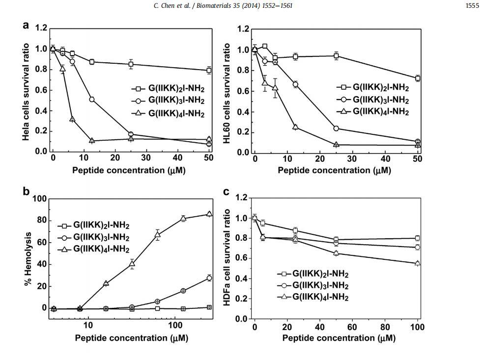 一段時間以來,天然抗菌肽(AMPs)及其合成類似物一直被視為新抗生素的潛在來源。AMP對廣泛的微生物表現出不同的抗菌活性,有趣的是,其中一些還表現出對癌細胞的毒性,但對正常哺乳動物細胞的生物相容性程度不同[2e4]。此外,由于這些AMP主要通過非受體介導的途徑作用于靶細胞膜,與傳統化療藥物相比,癌細胞更難產生耐藥性[3,4]。由于這些理想的特性,研究和開發具有癌細胞毒性的AMPs可能會在開發更好的抗癌藥物方面取得進一步進展。短的線性陽離子AMP在與其靶相互作用時折疊成兩親構象,代表了抗菌肽的一種特別成功的結構安排[5e7]。為了提高其在治療應用中的前景,并研究結構活性關系,已經設計和合成了許多類似物,以模擬天然AMPs的特征,并有不同的成功報道。主要障礙在于調整針對宿主細胞的毒性的效力。