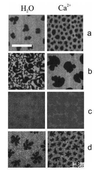 圖3:水上DPPC(a、b、c)和DMPS(d)單層的熒光圖像(左圖)和1 M CaCl2溶液(右圖),π)4 mN/M(a)、π)6.5 mN/M(b)、π)35 mN/M(c)和π)2 mN/M(d)。單分子膜用5 mol%羅丹明PE標記:亮區對應于LE相,暗區為LC結構域。比例尺代表15μm。所有圖像的對比度都相同。